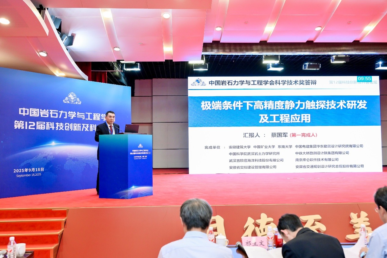 2025年10月17日至19日,CHINA ROCK 2025第二十二次中国岩石力学与工程学术年会在雄安新区顺利召开。在大会闭幕式上,隆重颁发了第十六届“中国岩石力学与工程学会科学技术奖”。团队蔡国军教授牵头申报的“极端条件下高精度静力触探技术研发及工程应用”项目,荣获科学技术进步一等奖。会议期间,项目组还应邀参加了CHINA ROCK 2025科技创新工业展览会,集中展示了项目研究成果,受到了与会专家的高度关注和一致好评。